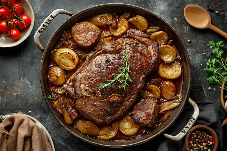 Выложите мясо и лук в форму для запекания.