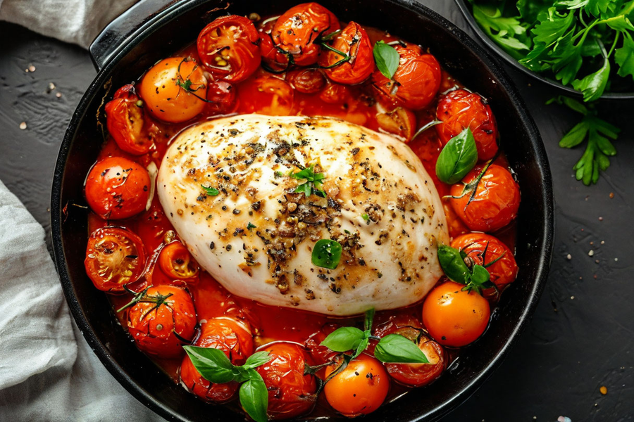 Выложите грудку в форму, сверху распределите помидоры и сыр.
